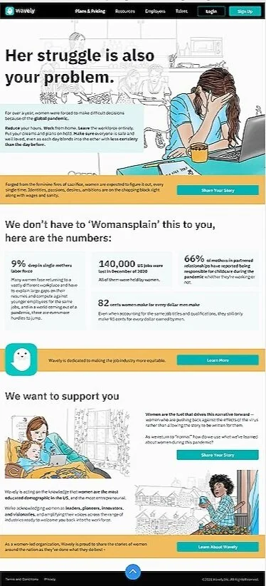 Concept: Women have been hardest hit economically by the pandemic. According to recent statistics, more than 11 million women have lost their jobs, and 2.7 million have left their jobs since February 2020. The situation is so dire that it has been labeled the "She-cession." There was an opportunity for Wavely to tap into the demographic of women who have lost jobs or left the workforce prematurely through targeted marketing campaigns.